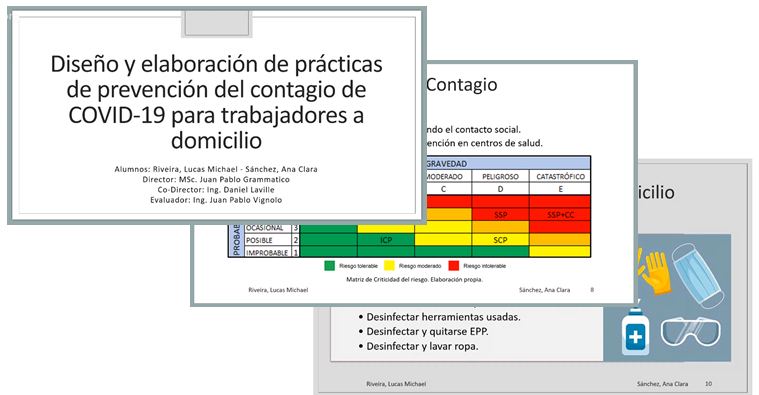 El día viernes 7 de agosto las 16:00 hs, tuvo lugar la defensa del trabajo final de carrera de los estudiantes Ana Clara Sánchez y Lucas Michael Riveira. El mismo consistió en el “Diseño y elaboración de prácticas de prevención del contagio de COVID-19 para trabajadores a domicilio”, donde contaron con la dirección de los Ing. Juan Pablo Grammatico y Daniel Laville.